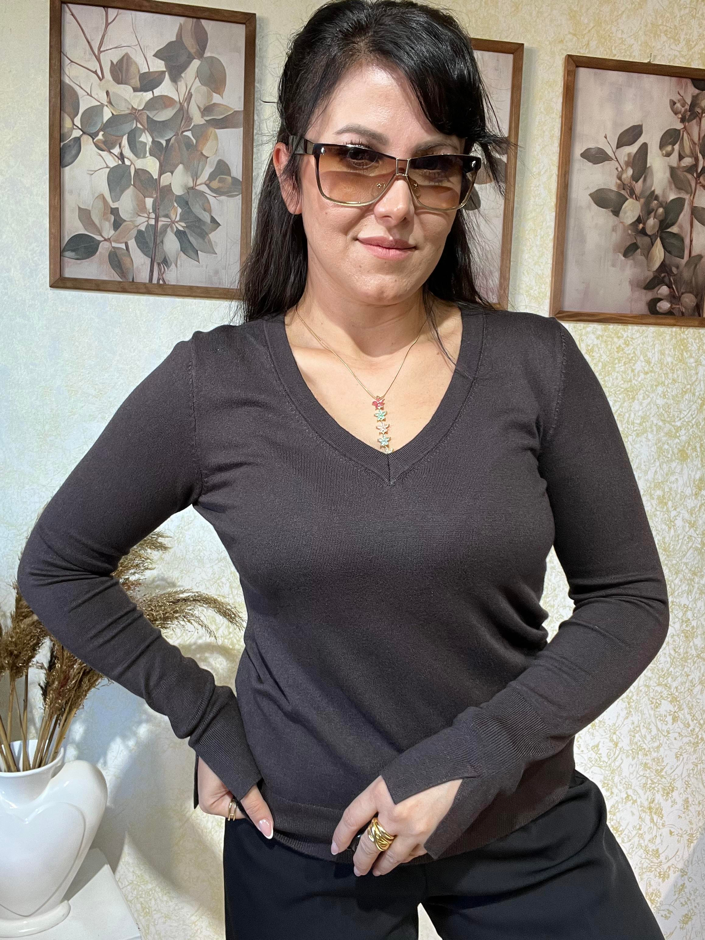 YUMUŞAK DOKULU, TRİKO,  V YAKA , KOL MANŞETLERİ YIRTMAÇ DETAYLI