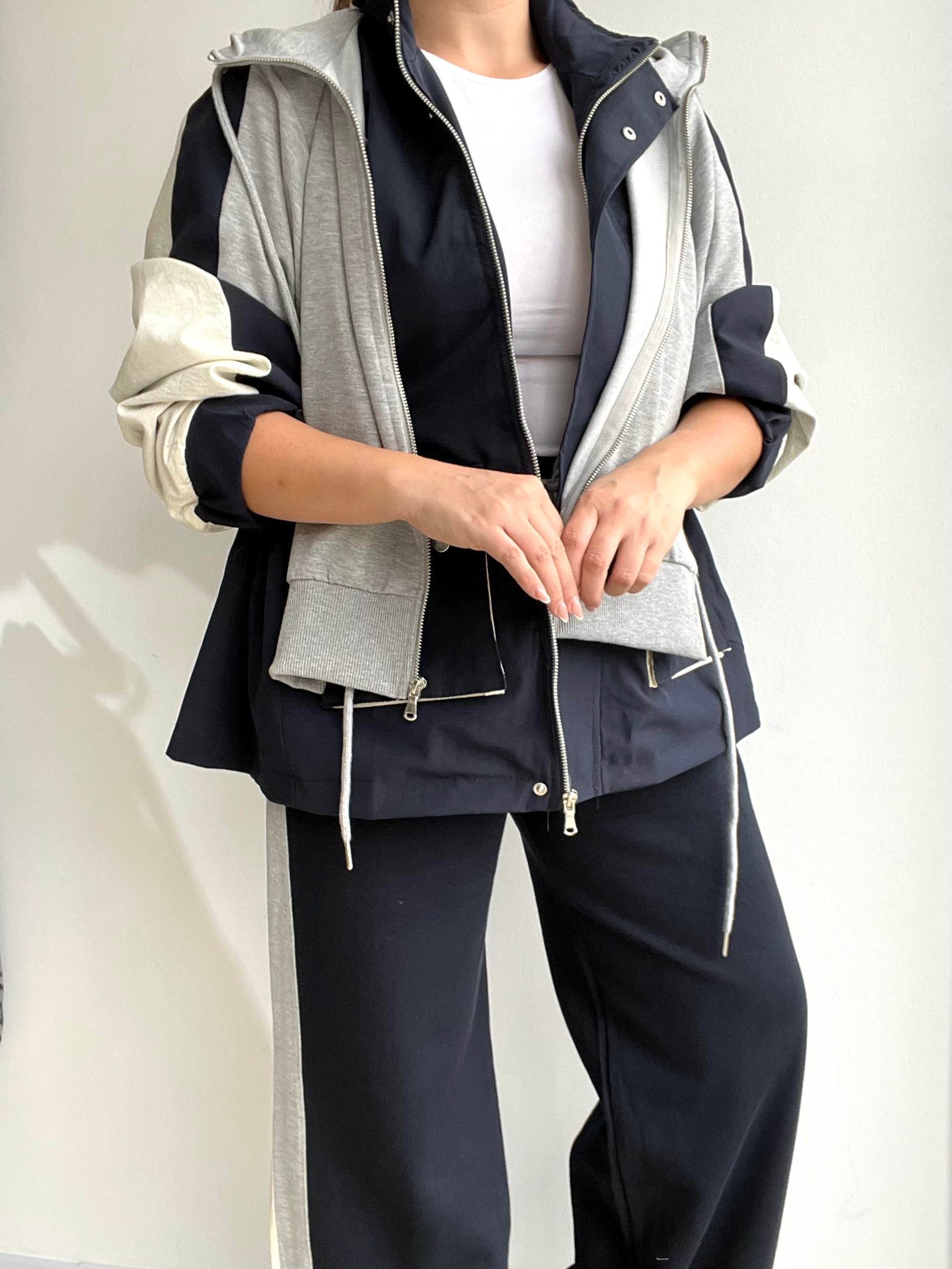 Ürün üstü, trençkot formunda, astarlı ,tasarım, kapüşonludur.Üstlük ve şerit geçişli eşofman altından oluşmaktadır.
